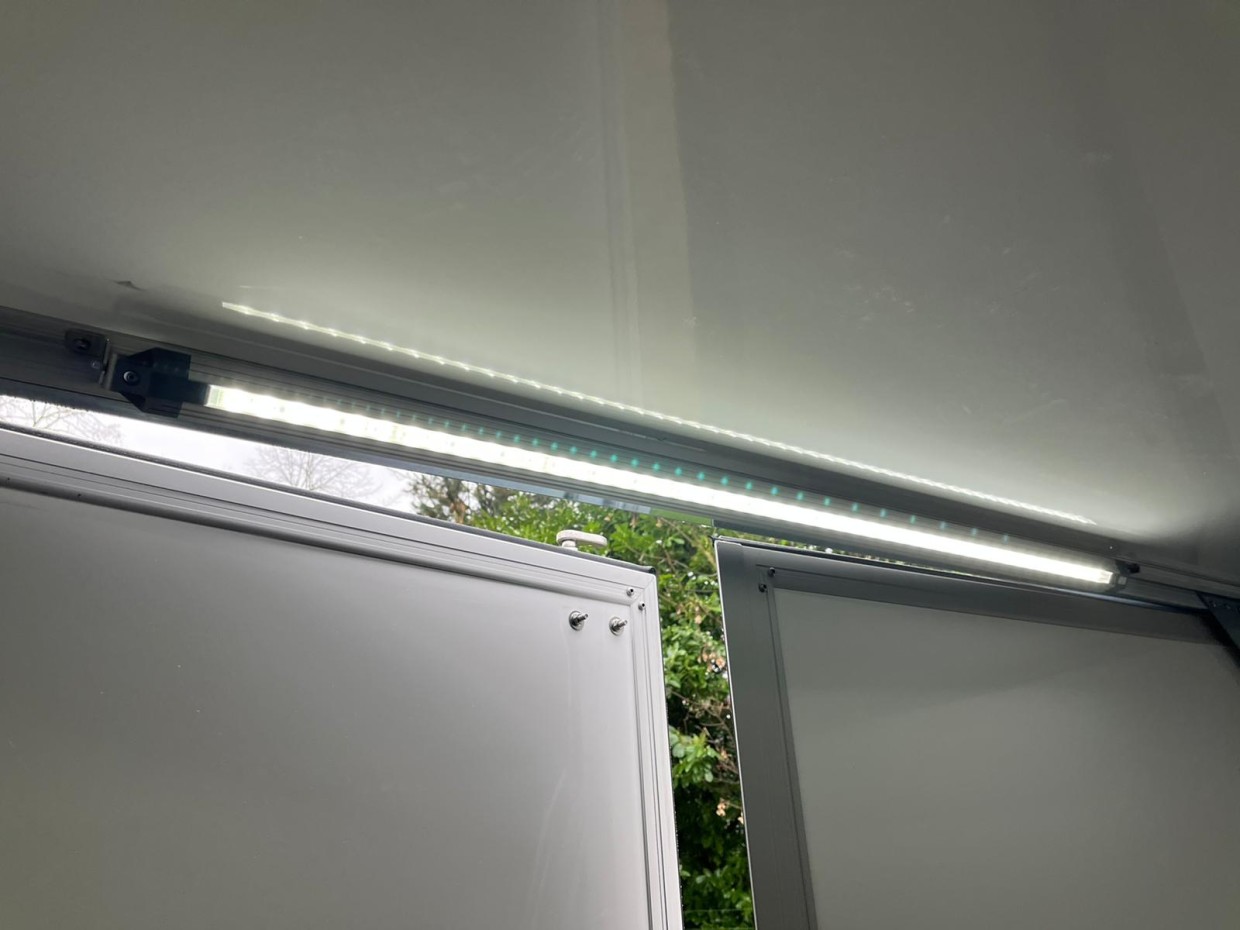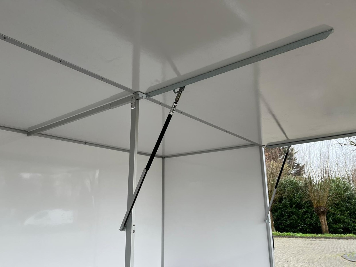 Deze Hapert gesloten aanhangwagen is uitgevoerd met 25mm wanden. Verder is er een zijklep in de rechterzijde met een terug geplaatste middenstijl gemonteerd. Om de binnenkant van de aanhangwagen te verlichting is er een lichtbalk van 110 cm gemonteerd. Verder is de aanhangwagen uitgevoerd met verstelbare steunpoten aan de achterkant.